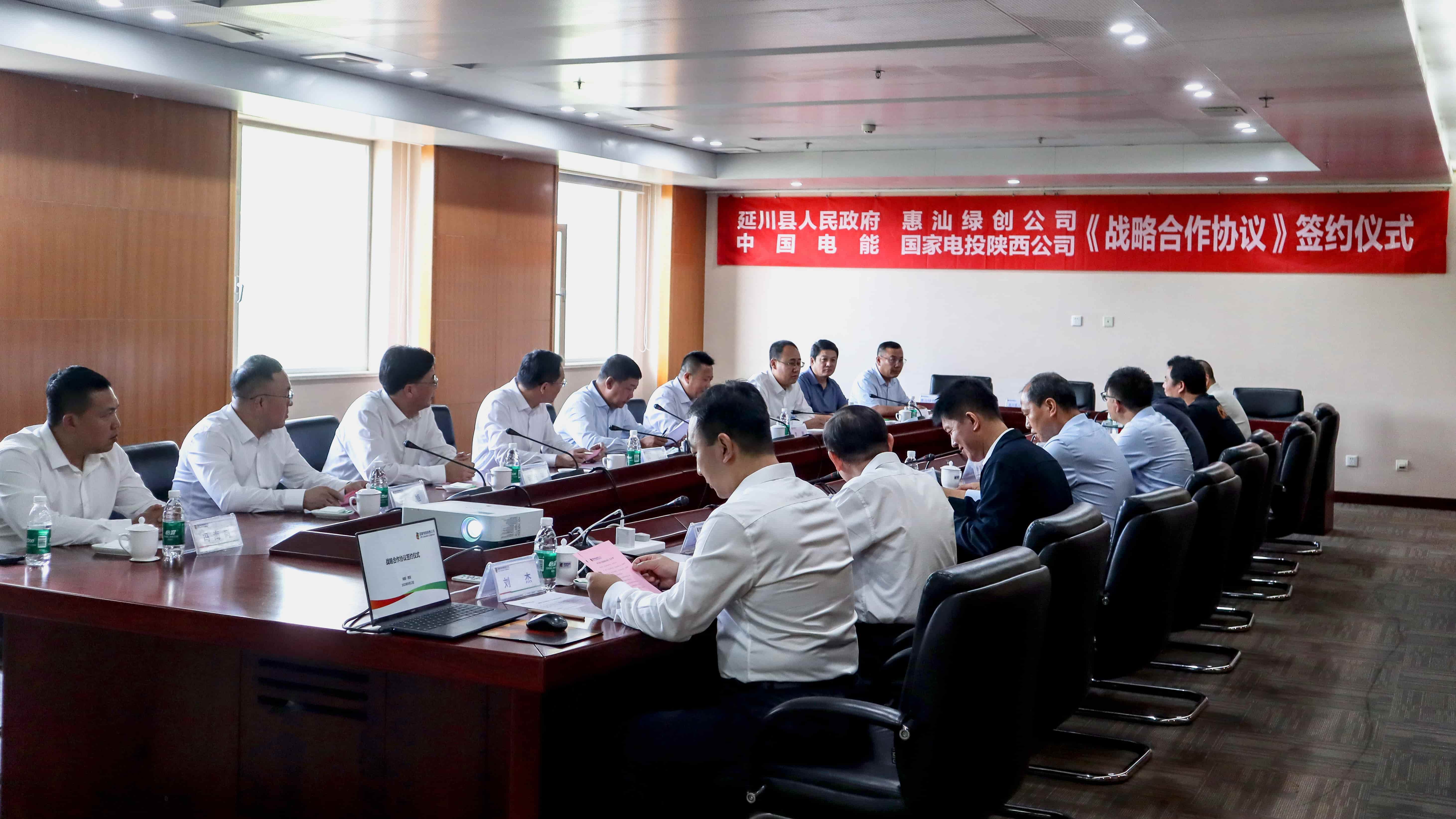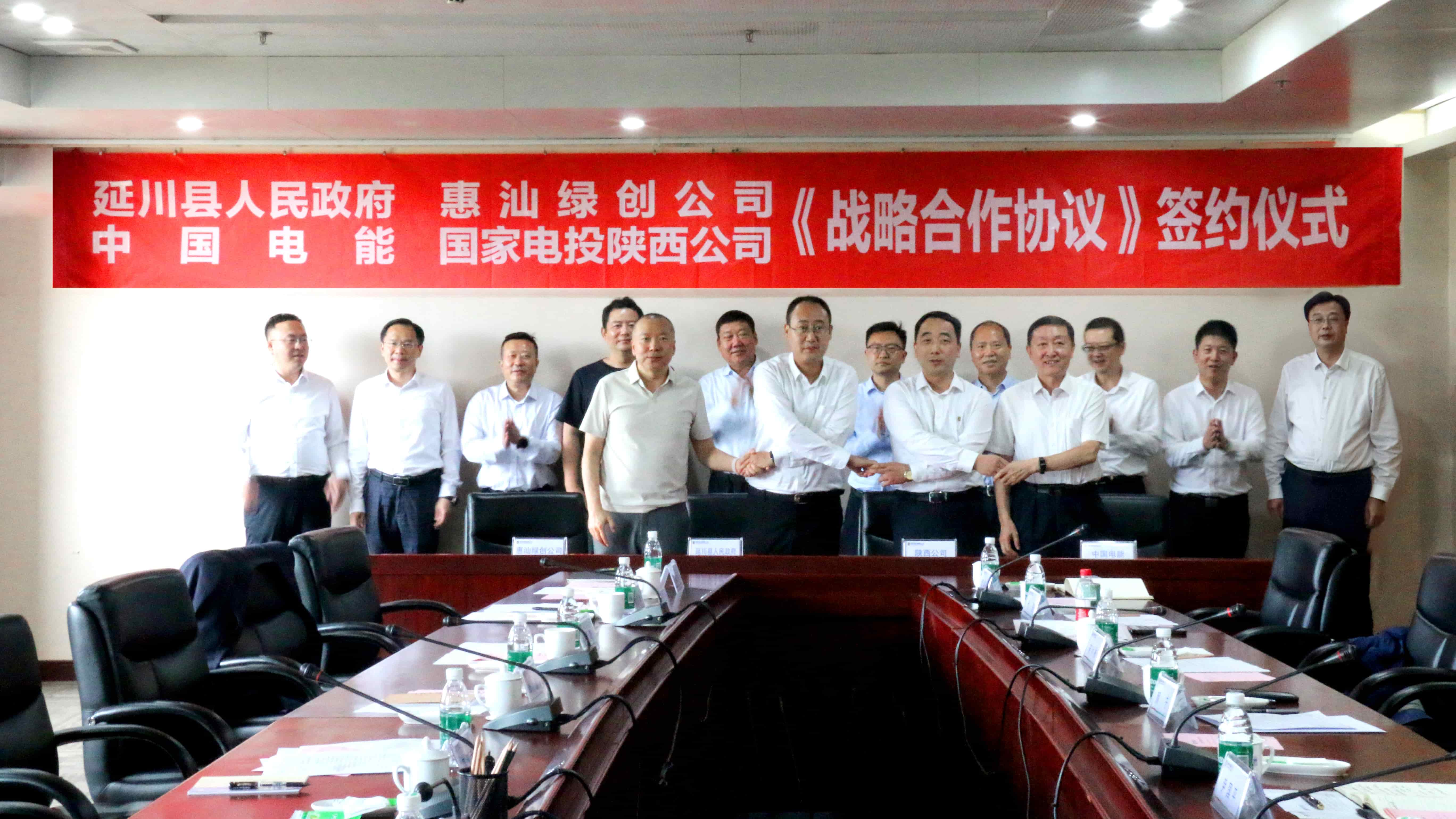 9 月 12 日,一场意义非凡的项目签约仪式在国电投陕西分公司隆重举行。本次会议由国家电投陕西公司党委委员、纪委书记颜宁主持。参加会议的有:国家电投陕西公司党委书记、董事长尹国平;中国电能党委委员、副总经理杨启斌;集团公司战略性新兴产业部处长陈晓飞;中国电能党委巡察工作组组长马维贤;国家电投陕西公司党群部(党委办)主任刘杰;延川县县委副书记、县长高汉武;延川县委常委、县政府副县长(挂职)李鹏、江城;延川县副县长崔泰康;延川县工业园区管委会主任梁桂平;延川县发展改革科技局局长王旭;延川县招商引资中心主任冯建杰;惠汕绿创(江苏)科技股份有限公司董事长芮叶彬、副总裁弋阳。